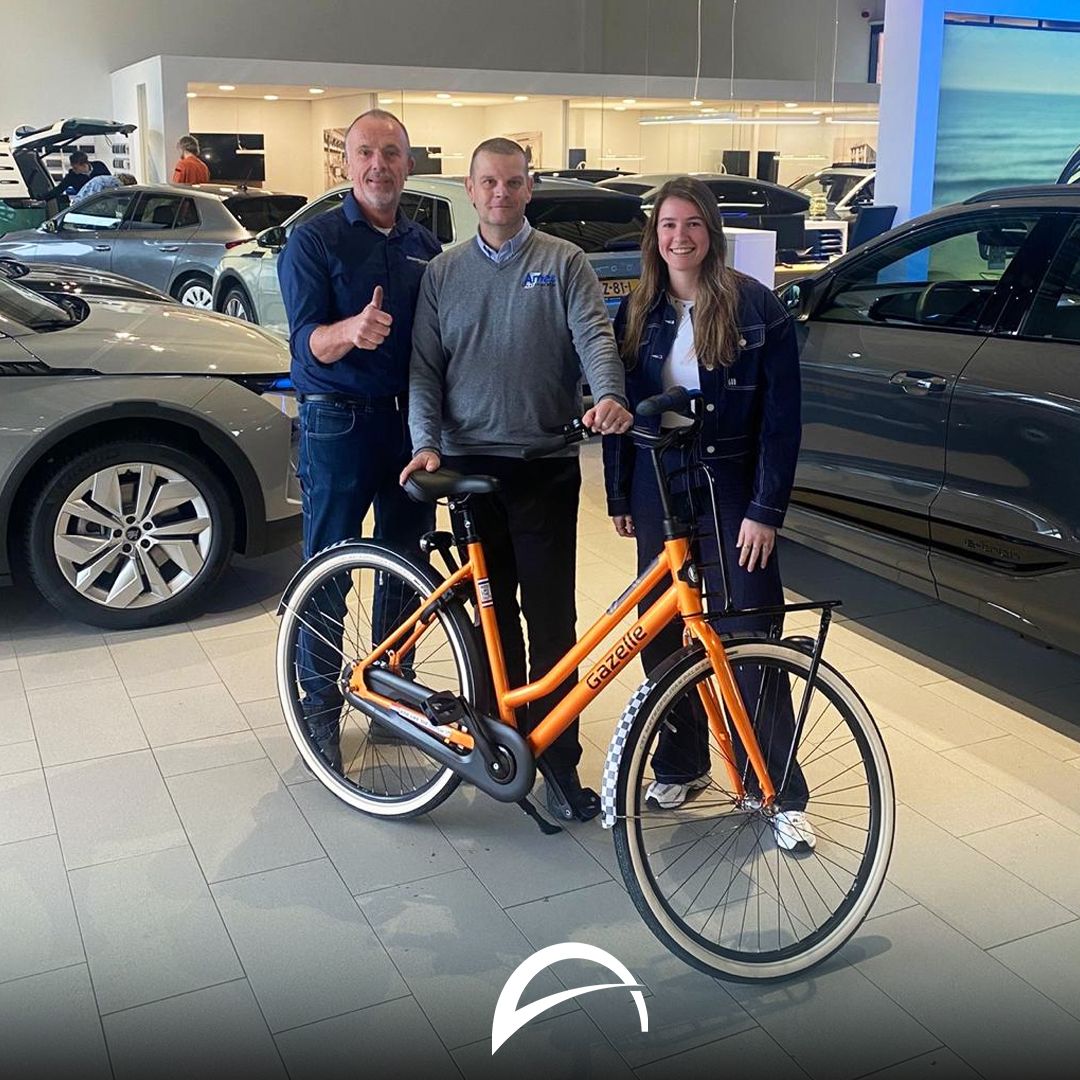 Om AI binnen Amega nog slimmer en beter in te zetten, hebben de afgelopen periode onze medewerkers meegedaan aan een enquête over hun ervaringen en behoeften rondom kunstmatige intelligentie (AI). Onder alle deelnemers verlootten we een schitterende Gazelle Zandvoort F1 fiets. | Op de foto reiken Ophely Hiele en Leo Lekkerkerker van Groeneveld Fietsen de prijs uit aan onze collega Peter Zwerver van Ames Autobedrijf Ridderkerk die de prijs heeft gewonnen. Peter nam de fiets als grote Formule 1 fan met plezier in ontvangst en vertelde direct dat hij voortaan op de fiets naar het werk wil komen. Peter, van harte gefeliciteerd en veel veilige kilometers gewenst!